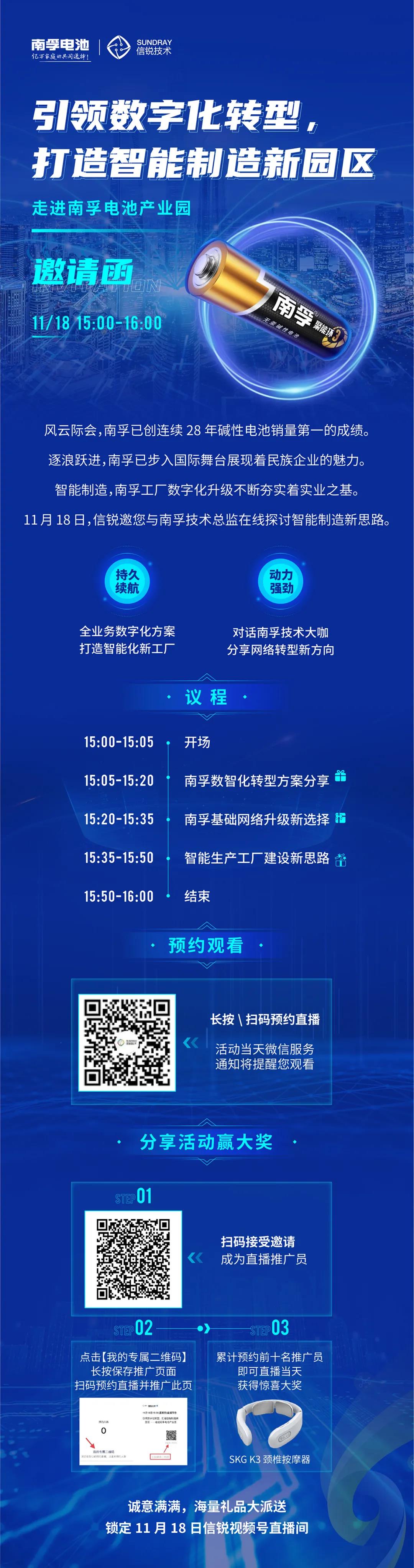 逐浪跃进,南孚已步入国际舞台展现着民族企业的魅力。智能制造,南孚工厂数字化升级不断夯实着实业之基。11月18日,信锐邀您与南孚技术总监在线探讨智能制造新思路。即刻扫码预约直播,活动当天即可微信观看!