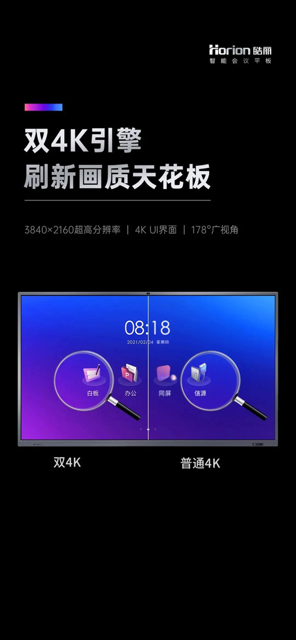 目前,市面上的会议平板在画质上基本已经达到4K分辨率,以满足大多数图片、视频在大屏上清晰展示。皓丽M5pro首次采用双4K引擎,再一次刷新行业画质天花板。皓丽全新自研4K全高清的UI界面,打磨细节体验,清晰度提升,带来图文更精细的显示效果。