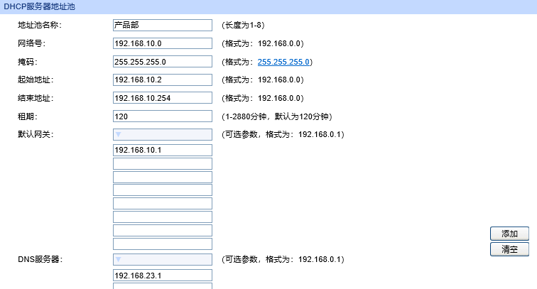 在“路由功能->DHCP服务器->地址池设置”中,输入相应的网络参数如下图所示,点击添加。其余VLAN重复步骤即可,完成后DHCP地址池列表如下: